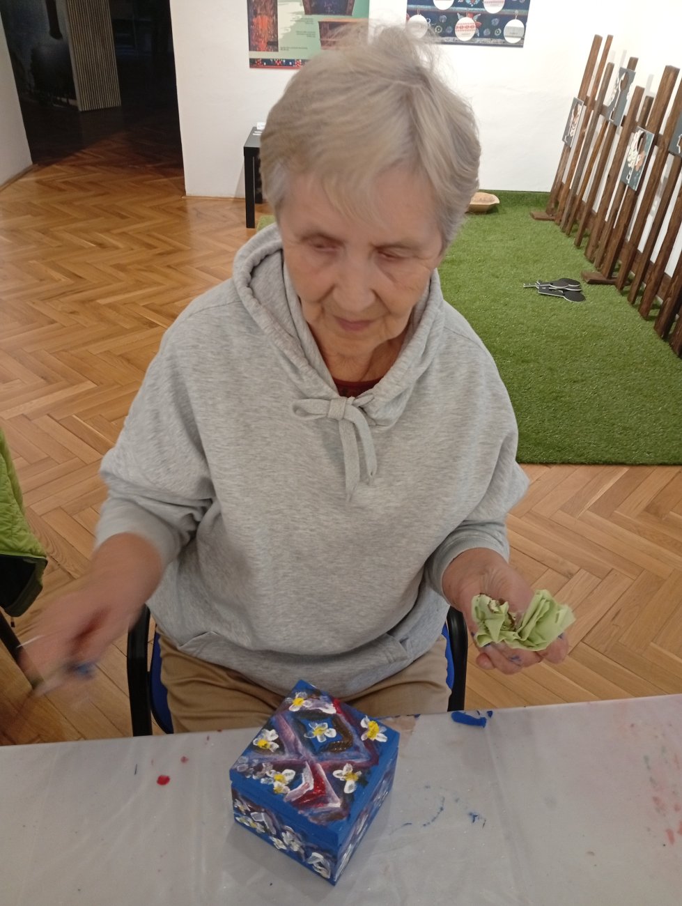 Dňa 15.10.2025 naši prijímatelia navštívili múzeum v Rimavskej Sobote v rámci tvorivých dielní – Úcta k starším. Vybrali si veľkosť truhlice. Potom si povyberali farby a maľovali. Nakoniec nám to zalakovali. Medzitým sme si pozerali výstavu truhlíc. Vyskúšali si súťaž čo patrí do nevestinej truhlice. Klientky boli šťastné a spokojné, že si odnášajú zážitok a truhličku na pamiatku.