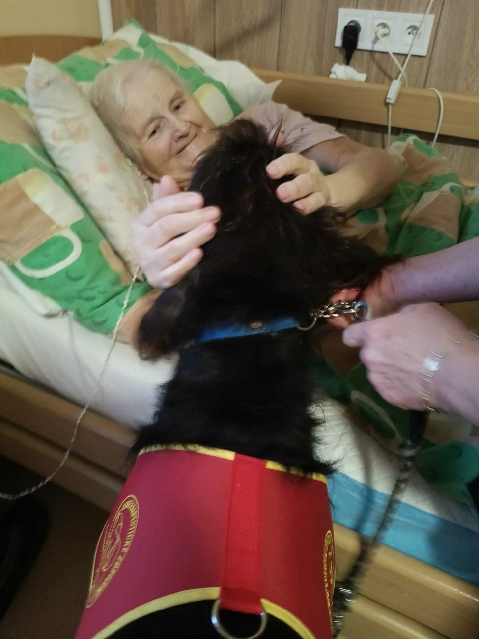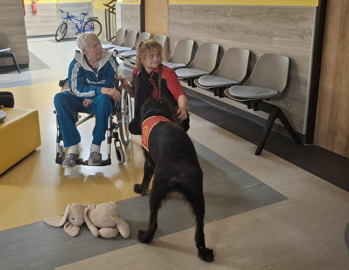 Po úvodnej časti sme sa presunuli k našim ležiacim klientom, aby si aj oni mohli užiť chvíle potešenia a blízkosti so zvieracím terapeutom. Psík trpezlivo a nežne reagoval na dotyky a hladenie, čo našim klientom prinieslo veľkú radosť a momenty uvoľnenia. Návšteva bola veľmi milá a obohacujúca. Veríme, že podobné stretnutia budeme môcť uskutočňovať aj naďalej, keďže prispievajú k lepšej nálade, aktivizácii a celkovej pohode našich klientov.