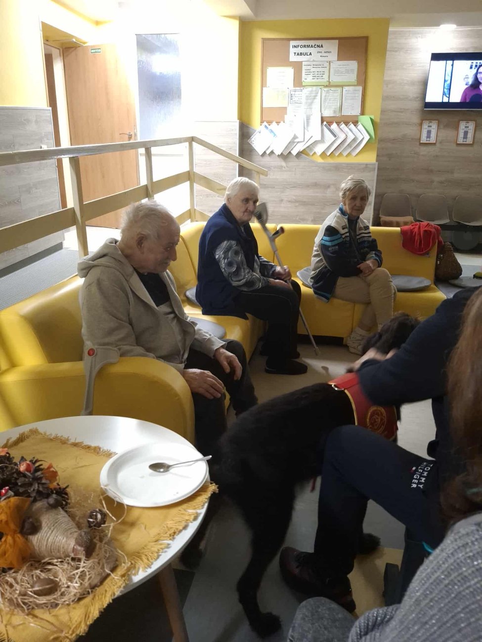 Dňa 16. novembra naše zariadenie navštívila pani so svojím terapeutickým psíkom v rámci canisterapie. Už od prvej chvíle sa medzi našimi klientmi vytvorila príjemná atmosféra plná očakávania. Stretnutie sme začali vo vestibule, kde nám pani predstavila svojho psíka a vysvetlila, ako canisterapia prebieha a aké pozitívne účinky môže mať na fyzické aj psychické zdravie človeka. Následne predviedli rôzne ukážky spolupráce, poslušnosti a kontaktu so psíkom, ktoré vyvolali úsmev na tvári u všetkých prítomných.